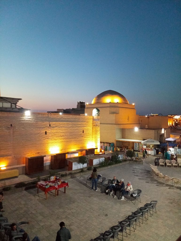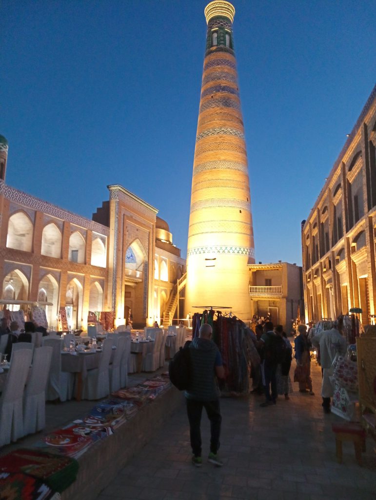 Hotelul din Khiva, Khiva Palace, a fost tot de patru stele, dar mi s-a parut ceva mai modest decat celalalte. In schimb, cele doua restaurante in care am servit cinele au fost foarte elegante. In plus, am mancat pe terasa, afara, si am avut parte de privelisti de vis cu partea veche a orasului, la apus si dupa lasarea intunericului.