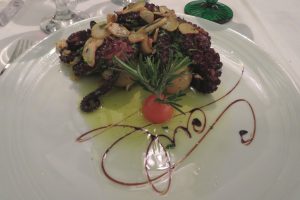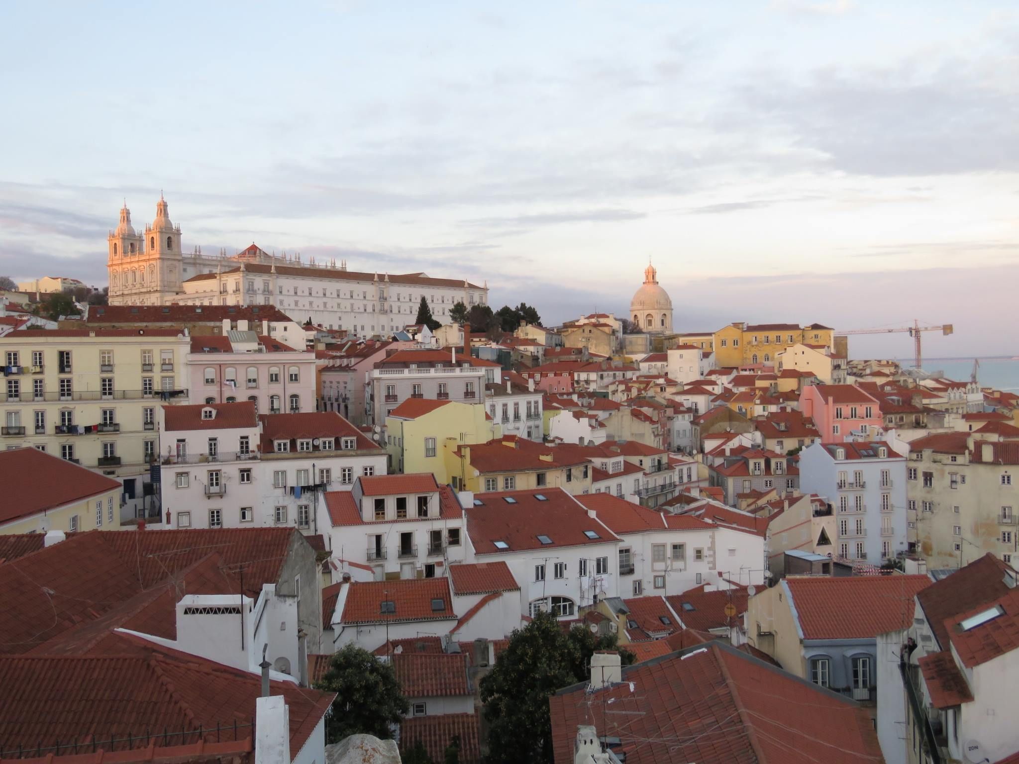 scurta distanta am intalnit o placuta piateta cu cateva terase si mici localuri, langa care se afla Miradouro das Portas do Sol, avand o deschidere mai larga fata de precedentul. Urmatorul a fost punctul culminant, ramanand si in prezent preferatul nostru din intreaga Lisabona, Miradouro da Graça. Ne-am asezat la terasa panoramica de aici, care avea preturi foarte mici in pofida amplasamentului sau, unde am savurat un pahar de ginja (lichior local facut din cirese amare) si o bere Super Bock (o uzuala bere locala de tip lager). Imi voi aminti intotdeauna cu drag de imaginea Lisabonei pe inserat vazuta din Miradouro da Graça, foarte putine orase din Europa sunt privilegiate cu asemenea panorame spectaculoase. Ziua s-a incheiat cu cina pe care am luat-o in restaurantul Colina, aflat din apropiere de hotelul unde ne-am cazat, fiindu-ne recomandat de unul dintre receptioneri. Gratie cardului de recomandare primit am fost recompensati la finalul mesei de catre chelner cu cate un pahar de vin de Porto. Caracatita a fost destul de gustoasa, am savurat-o impreuna cu o garnitura de cartofi fierti si fasole verde, precum si un pahar de vin alb.